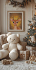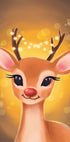 Et sødt og eventyrligt rensdyr-portræt med glitrende lyskæde på geviret og en varm gylden baggrund. Den bløde illustration og det venlige smil gør motivet både hyggeligt og legende. Ideel til julepynt i hjem, der ønsker lidt vintermagi på væggen.