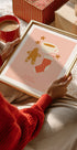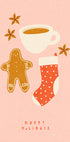 En lun og legende juleillustration af NKTN: en dampende kop kakao, en smilende peberkagemand og en stribet julesok sætter scenen, mens snefnug danser i baggrunden. Blød, vintage-inspireret farvepalet og humoristiske detaljer giver hyggelig julestemning til stue, børneværelse eller entré. Perfekt som gave eller til årets vinterhygge.