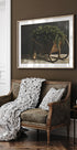 Et stemningsfuldt vinterstilleben med en træslæde, grønne grene og en lille lanterne. De mørke nuancer og bløde skygger giver et roligt, elegant og hyggeligt juleudtryk.