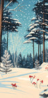 En fredelig vinterillustration af en snedækket skov med høje fyrretræer og faldende snefnug. Røde bær giver et festligt præg til det rolige landskab, perfekt til jul og vinterpynt.