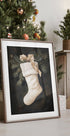 En elegant juleplakat med en hvid julestrømpe med fluffy kant, pyntet med grankviste, kogler og en gylden sløjfe. Den lyse, let frostede baggrund fremhæver det grønne og skaber ro. Et klassisk, tidløst motiv, der bringer varme, duft af gran og traditionel julehygge ind i hjemmet hele sæsonen. Med grønne og gyldne toner.