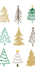 En moderne minimalistisk illustration med en samling abstrakte juletræsdesign i grønt, guld og brunt. Hvert træ har en unik håndtegnet stil, perfekt til julepynt og festlig vægkunst.