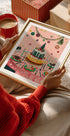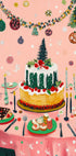 Detta färgstarka julmotiv visar ett festligt dukat bord med en stor, fantasifull tårta i centrum. Tårtan är dekorerad med grönt, vitt och röda bär samt ett litet julgransträd på toppen. Runt bordet står tallrikar fyllda med olika godsaker, ljus i olika färger och små detaljer som bidrar till en varm och lekfull stämning. Bakgrunden är rosa och prydd med hängande julkulor, girlanger och stjärnor, vilket skapar en livlig och glädjefylld atmosfär som fångar julens magi.