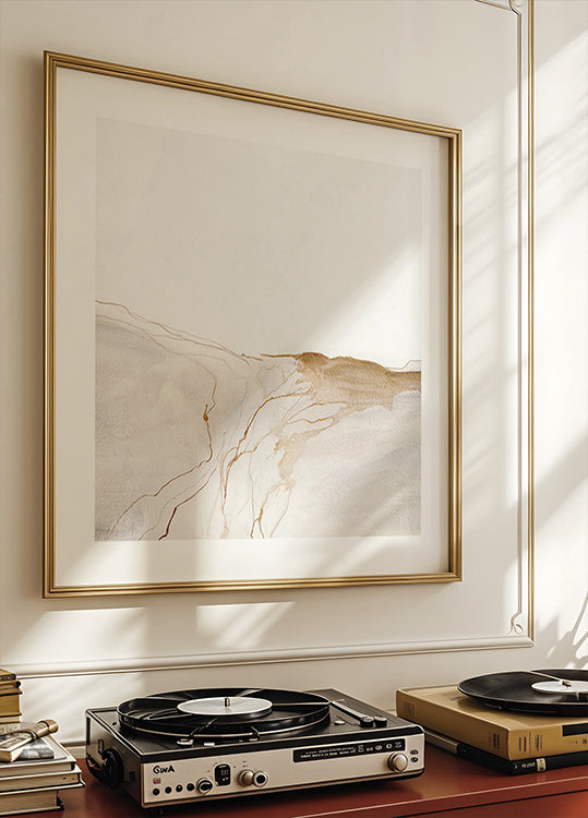 Clarity II af Alma fanger en stille, tidløs stemning: et abstrakt landskab i neutrale toner, hvor bløde linjer antyder kyst, klitter og fjerne bjergsilhuetter. Den diskrete tekstur og harmoniske komposition giver et poetisk, retro-præg, der skaber ro og dybde i både moderne og rustikke rum. Perfekt til stille vægge og rolige farveskemaer.