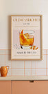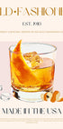 En retroinspireret plakat af Old Fashioned cocktail med et whiskeyglas, appelsinskal og isterninger. Med tydelig typografi og vintage design hylder dette kunstværk den tidløse amerikanske cocktail. Perfekt som køkkendekoration, barplakat eller til hjemmebaren.