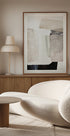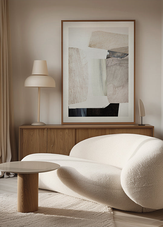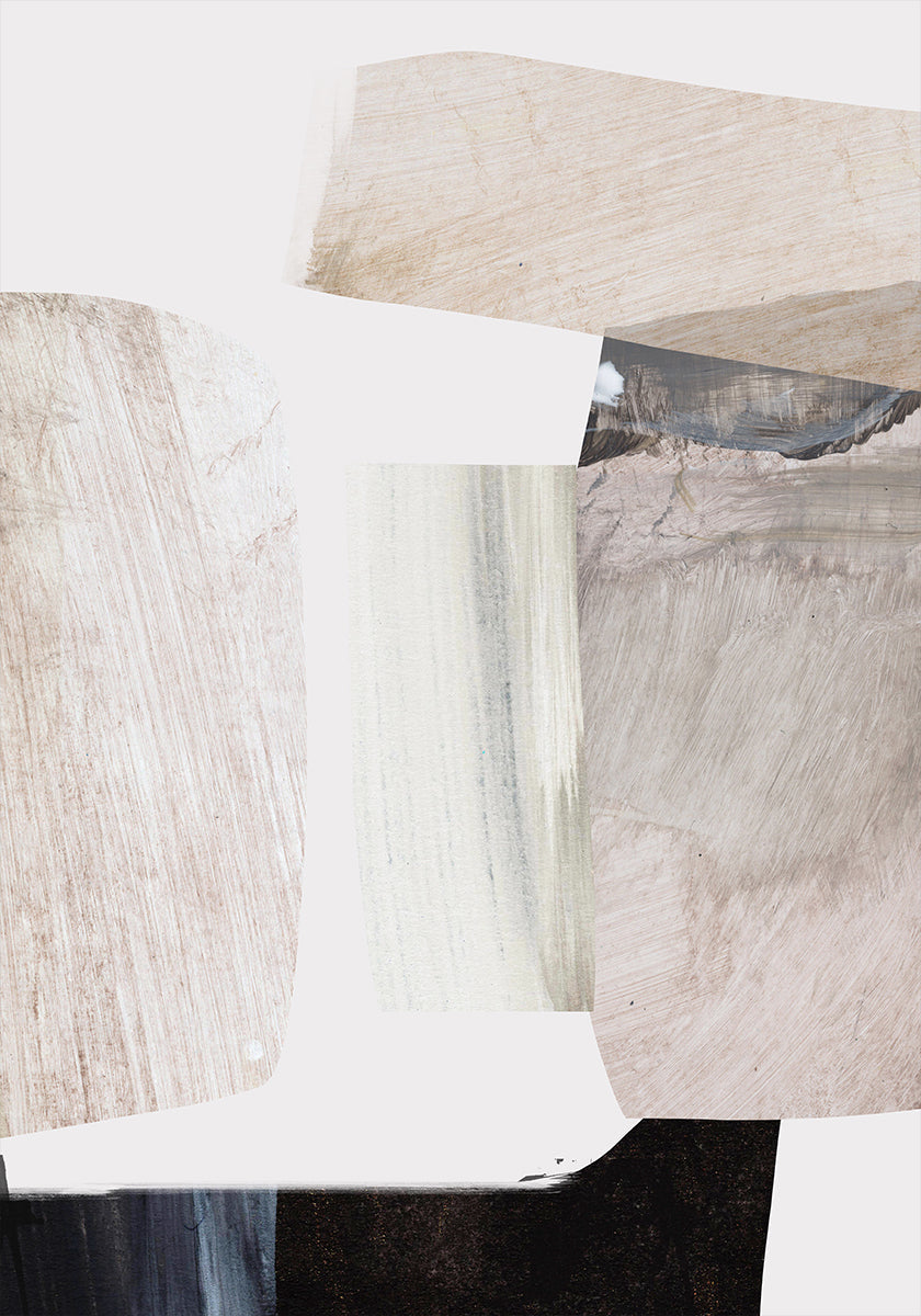 En minimalistisk abstrakt plakat af Dan Hobday med bløde lag af penselstrøg i neutrale toner. De teksturerede former skaber en afbalanceret og moderne komposition, perfekt til moderne interiører, skandinavisk design eller som en del af en beroligende billedvæg.