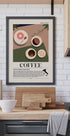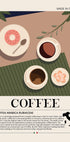 En italiensk-inspireret plakat, der viser en oversigt af kaffekopper, en dessert og sukkerknalder på et bord. Plakaten fremhæver kaffens historie og produktionsproces med fokus på den italienske espresso-tradition. Perfekt til caféer, kaffeelskere og entusiaster af italiensk kultur.