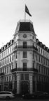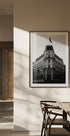 Et majestætisk sort-hvidt fotografi af en historisk bygning i København, kronet med klokketårn og elegant flag. Den detaljerede facade og storslåede symmetri afspejler tidløs europæisk charme og gør dette print til et sofistikeret vægkunstværk til interiører inspireret af arkitektur, kultur og klassisk byliv.
