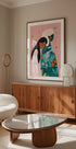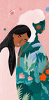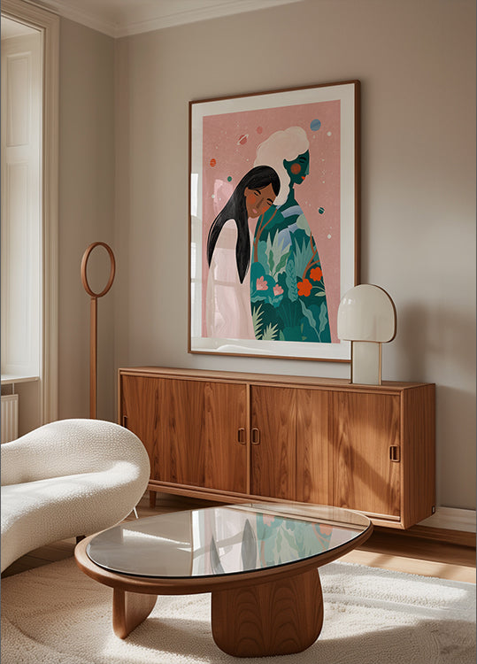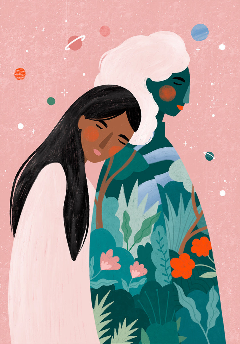 En symbolsk og moderne illustration, der viser to kvinder omgivet af kosmiske elementer og frodig natur. Kunstværket udtrykker temaer som beskyttelse, moderskab, venskab og harmoni mellem mennesker og natur.
