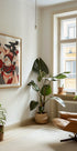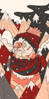 En hyggelig vinterkat tager scenen i et sneklædt landskab, hvor bløde flager falder over stille bjerge i baggrunden. Den varme, tegneserieagtige stil spreder julestemning og ro, perfekt til stuen i den kolde sæson. En charmerende illustration af Stephen Wade, der fanger både leg og lune. Et vinterpostkort til væggen.