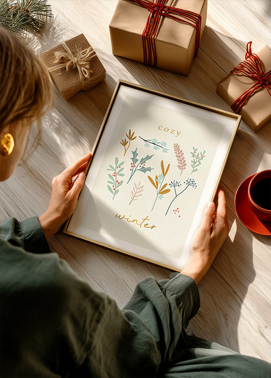 Botaniske vintergrene og blomster i blide pasteller møder fine gyldne accenter og håndskrevet typografi, der hvisker Cozy Winter. Frostede detaljer og lette snefnug giver ro og varme på samme tid, perfekt til jul og mørke aftener. En stilren sæsonplakat af Goed Blauw. Perfekt til entré, stue og børneværelse.