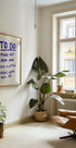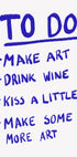 Et legende og motiverende typografiværk med en håndskrevet "To Do"-liste: Lav kunst, drik vin, kys lidt, lav mere kunst. Med fed blå tekst på hvid baggrund kombinerer denne sjove og moderne plakat humor, romantik og kreativitet – perfekt til par, kunstnere eller alle der elsker at leve med passion.