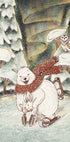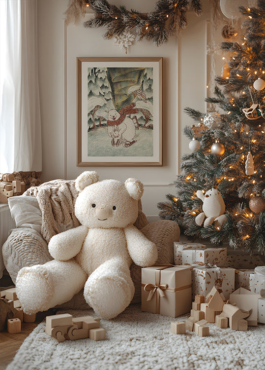Skabt af Olena Kovalova: Creatures of the North forener en venlig bjørn og en nysgerrig kanin i et sneklædt nordland. Dæmpede røde, grønne og teal nuancer og et strejf af vintage giver varm julestemning, mens de rolige detaljer indbyder til nærvær og hygge i vinterens stille dage. Perfekt til julens hyggelige hjørner.
