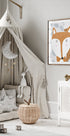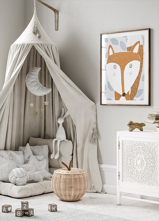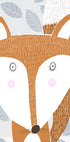 En sød rød ræv står midt i et stiliseret vinterlandskab, omgivet af grå bladmotiver, der danner et roligt, nordisk mønster. De varme røde nuancer kontrasterer de kølige grå toner og skaber en hyggelig, grafisk stemning med et legende udtryk. Skabt af kunstneren Carla Daly – perfekt til børneværelse og nordisk indretning.