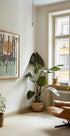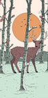 Deer In The Forest af Nicholas er en minimalistisk plakat med en stolt hjort, der står roligt blandt slanke birketræer i et frostklart skovlandskab. Dæmpede grønne og creme toner møder grafiske linjer og et blidt sollys, der skaber en japanskinspireret rolig stemning til stuen, soveværelset eller kontoret.