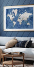 Et elegant og detaljeret verdenskort af Rosana Laiz Blursbyai: kontinenterne fremstår i kølige blå akvareltoner med tydelige landegrænser, havnavne og markeringer af større byer. Subtile label-typografier giver overblik uden at forstyrre helheden – perfekt som tidløs vægkunst og rejseinspiration. Skalaen og bynavnene inviterer til dagdrømme.
