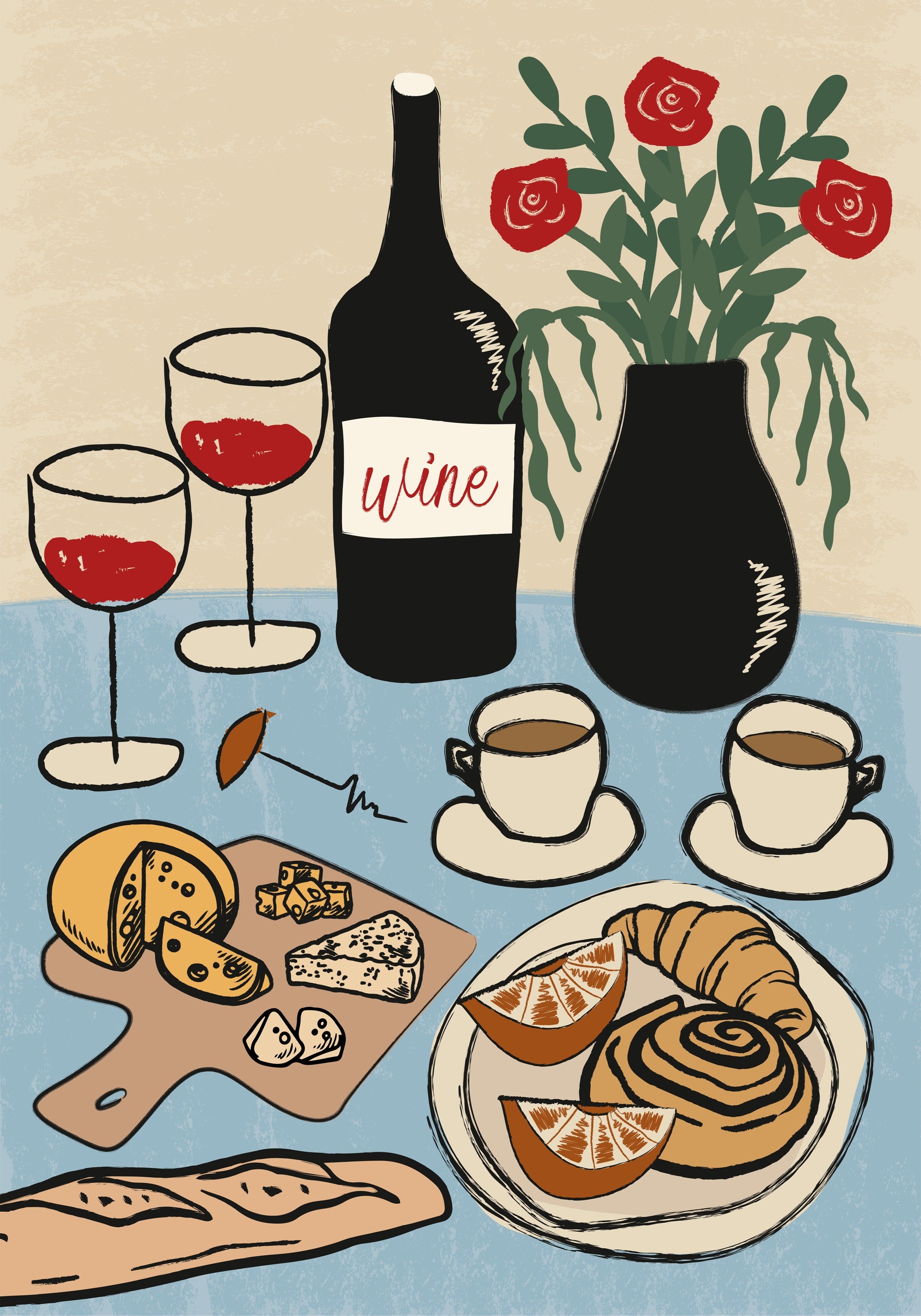 En hyggelig og romantisk illustration af et bord dækket med vin, kaffe, oste, croissant, citrus og en vase med roser. Det er en stemningsplakat med varme farver og kontinentalt udtryk – ideel til køkkenet eller spisepladsen.
