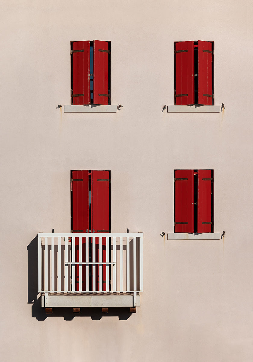 Andrea Comaris Distinct Shadows fanger en solrig italiensk husfacade i Caorle nær Venedig: røde og okkergule vægge, grønne skodder og en lille balkon, hvor skarpe skygger tegner grafiske mønstre. En urban scene fuld af farve, rytme og feriestemning, der bringer middelhavscharme ind i hjemmet. Hver dag.