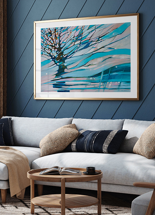Dynamic Interplay af Beata Brząkalik-Gburek fanger et poetisk vinterlandskab i abstrakte, flydende former. Bløde pasteller i blå og rosa gløder over en rolig horisont, hvor lag af lys og skygge skaber dybde og bevægelse. En moderne accent, der bringer stil og harmoni til rummet. Perfekt til stue, entré eller kontor.