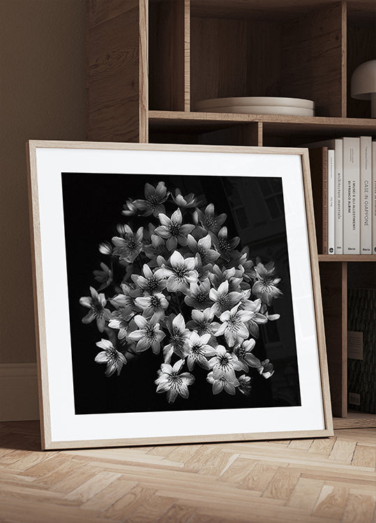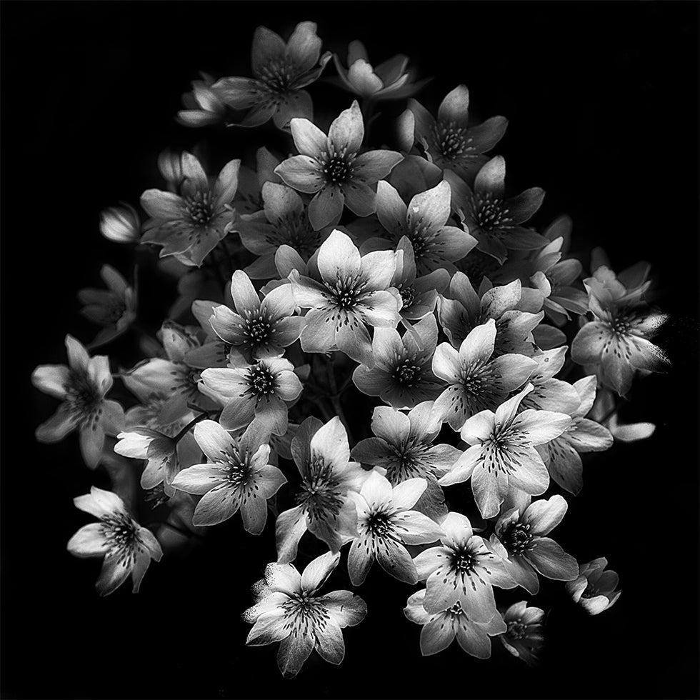 Early Sensation af Yvette Depaepe er et poetisk, sort-hvidt portræt af clematis i blomst. Mod en dyb, fløjlsmørk baggrund træder lysende kronblade frem med skulpturelle kurver og fine årer, som afslører blomsternes stille drama. Et raffineret botanisk stilleben med ro, kontrast og tidløs elegance. Skabt i Brugge, Belgien.