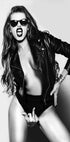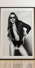 Et dristigt og edgy sort-hvidt portræt af en kvinde i læderjakke og solbriller, der udstråler selvtillid og attitude. Dette slående modeinspirerede kunstværk kombinerer sensualitet, oprør og glamour, og er perfekt til moderne interiør, modeområder eller som et statement i samtidskunst på væggen.