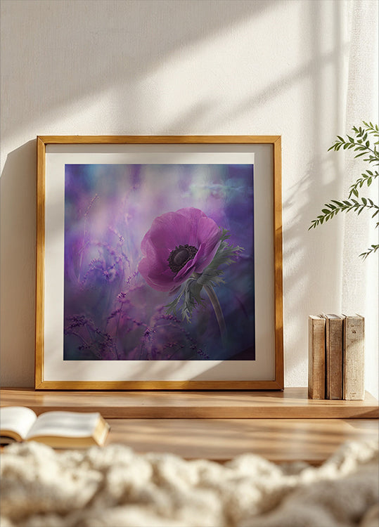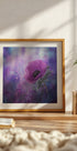 Ecstasy af Natalia Simongulashvili (NATALIORION) indfanger et drømmende botanisk øjeblik: bløde lilla blomster og fine græsstrå træder frem i et fløjlsblødt lys, indrammet af en diskret vignette. En rolig floralscene, der skaber fordybelse, poesi og et strejf af havemagi i rummet. Skaber en svævende, poetisk ro i hjemmet.