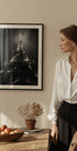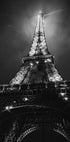 Et slående sort-hvidt fotografi af Eiffeltårnet oplyst mod nattehimlen i Paris. Den dramatiske vinkel og de glødende lys indfanger monumentets storhed og gør dette print til et stærkt statement i interiører, der hylder rejser, arkitektur og den tidløse romantik i Lysets by.
