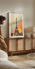 En iøjnefaldende retroinspireret illustration af Eiffeltårnet i Paris, sat mod en dristig regnbuestribet baggrund med en varm gylden sol. Kombinationen af vintagefotografi og livlig grafisk design skaber et nostalgisk, men samtidig moderne rejseinspireret kunstværk, perfekt til Paris-elskere, arkitektur og farverig vægdekoration.