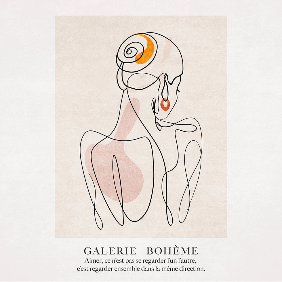 Elegant Silhouette af Emel Tunaboylu er en raffineret linjetegning, hvor få, flydende streger former en kvindelig silhuet i rolig balance. Den monokrome komposition og generøse negative rum skaber et tidløst, bohemepræget udtryk, der tilfører ro, poesi og modernitet til stue, soveværelse eller entré.