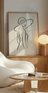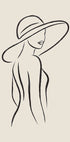En yndefuld, minimalistisk stregtegning af en kvinde med bredskygget hat, fanget i en elegant sidevendt positur. De enkle sorte streger på en blød beige baggrund skaber en ubesværet chic og tidløs modeillustration — perfekt til moderne interiører og stilfulde gallerivægge.