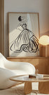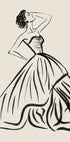 En yndefuld stregtegning af en kvinde i en flydende kjole, fanget i en tidløs og stilfuld positur. De minimalistiske sorte streger på en blød beige baggrund giver kunstværket en chic modeillustrationsstemning — perfekt til garderober, studier eller moderne gallerivægge.