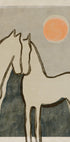 Equine Embrace af Treechild indfanger hestens rolige kraft i et minimalistisk, geometrisk formsprog. Bløde pastelfarver og nuancer af grøn smelter sammen med en lav sol, der antyder skumring over åbne vidder. Et moderne, poetisk motiv, der bringer natur, ro og vestlig stemning ind i dit rum. Perfekt til moderne interiører og elskere af heste.