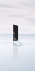 Et surrealistisk konceptuelt kunstværk, der viser en person, der træder gennem en mørk dør over rolige, reflekterende vande. Den minimalistiske opstilling, med en trappe der fører ind i intet, fremkalder temaer som flugt, afrejse og nye begyndelser. Scenen blander drømmelignende surrealisme med midcentury-inspireret æstetik.