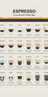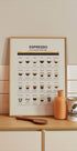 En detaljeret espressoplakat med en illustreret oversigt over klassiske italienske kaffedrikke. Fra espresso og doppio til cappuccino, latte og affogato – denne køkkenplakat er både lærerig og stilfuld. Perfekt vægkunst til caféer, kaffebarer og hjemmekøkkener.