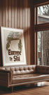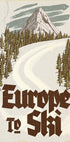 En vintage hyldest til alperejsen: snedækkede tinder rejser sig over mørke fyrreskove, mens en rød svævebane glider over pisten. Retro typografi kalder mod Europas ikoniske skisportssteder—fra Chamonix og videre. Dæmpede grønne og brune toner møder skarp vinterhvid og vækker ren rejsefeber. Perfekt til vinterdrømme.