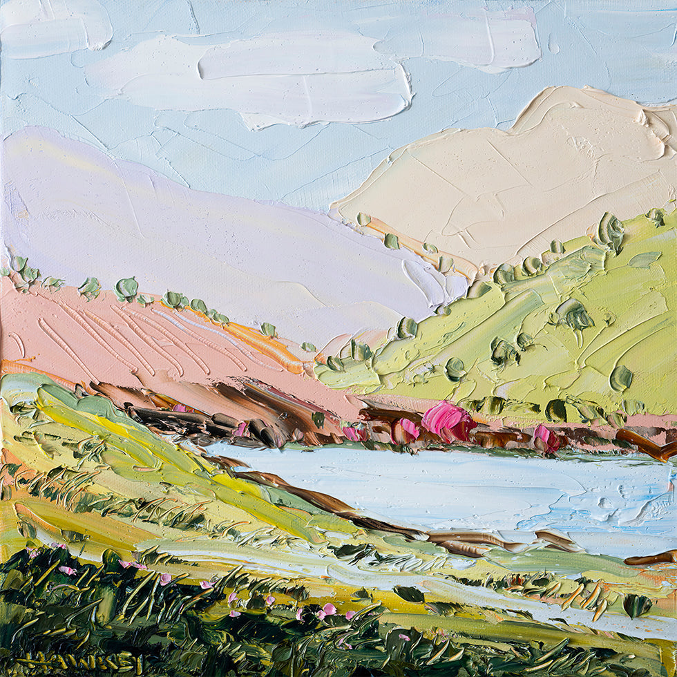 Evelyn af Angela Hawkey skildrer et drømmende landskab, hvor bjerge møder en spejlblank sø under en dramatisk, skyfyldt himmel. Bløde akvarelstrøg i blå, rosa og gyldne toner lader lyset danse over vandet, mens tågede konturer og rolige refleksioner skaber en fredfyldt, poetisk stemning. Et værk der indbyder til fordybelse og stille drømme.