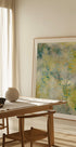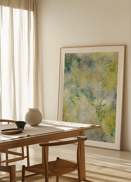 Et delikat impressionistisk kunstværk, der blander botaniske former med bløde maleriske teksturer. Sarte nuancer af grønt, blåt og gyldent gult skaber en drømmende og fredelig atmosfære, der indfanger naturens flygtige skønhed. Perfekt til at tilføje en beroligende og kunstnerisk stemning til ethvert rum