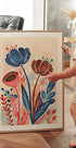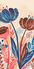 En livlig botanisk illustration med markante røde, blå og jordfarvede blomster mod en blød, tekstureret baggrund. Den levende blanding af farver og organiske former tilfører varme og charme — et perfekt værk til at lyse op køkkener, stuer eller en moderne gallerivæg.