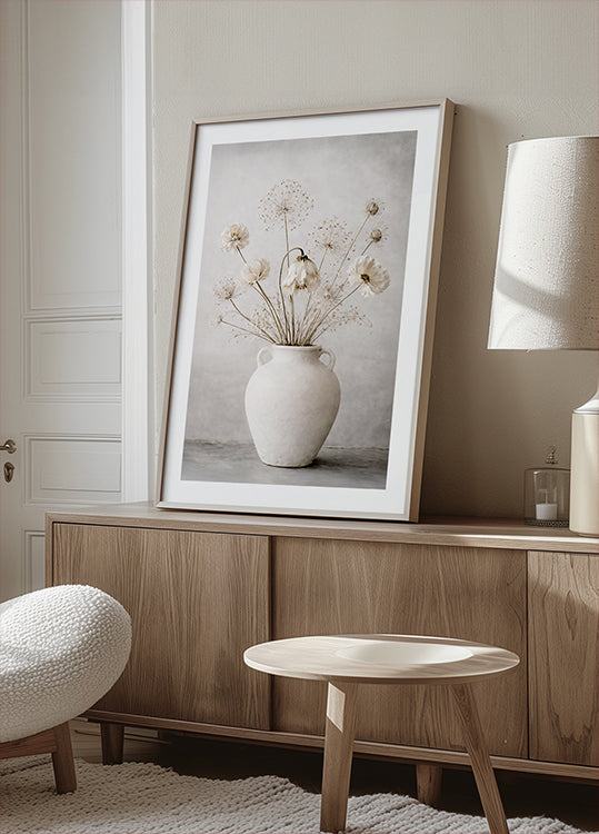 Fading Meadow af Annika Persson indfanger en stille eng i opløsning: fine græsstrå og sarte blomster tegner slørede silhuetter mod en lys, neutral baggrund. De dæmpede, naturlige toner og den minimale komposition skaber en rolig, poetisk stemning, der tilfører væggen luft, balance og tidløshed. Perfekt til rolige, naturinspirerede rum.