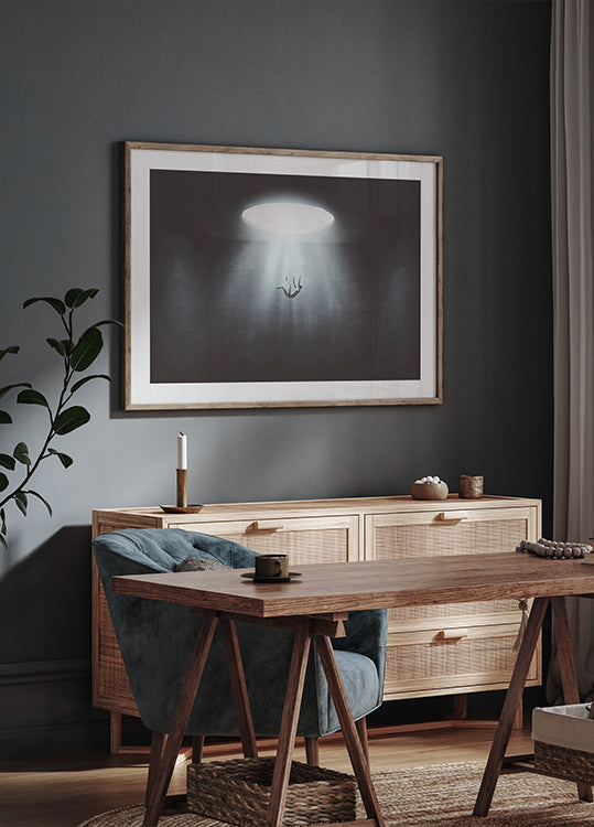 Faldende fra Lyshullet**-plakaten er et fængslende surrealistisk kunstværk, der indfanger øjeblikket af frit fald ind i det ukendte. En ensom skikkelse svæver ned fra en lysåbning, et stærkt symbol på overgang, eftertanke eller en flugt fra mørket. Perfekt til moderne interiør, meditationsrum eller som en tankevækkende statement-plakat.