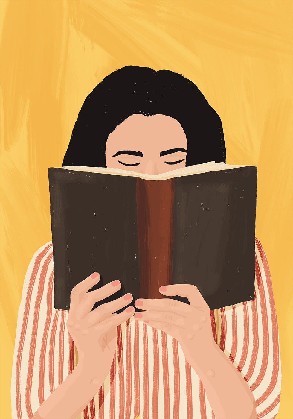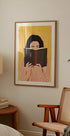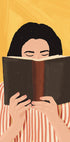 En varm og indbydende illustration af en kvinde dybt opslugt af en bog, sat mod en rig gul baggrund. Den stribede skjorte og de jordfarvede toner tilfører en hyggelig, moderne charme — perfekt til læsehjørner, biblioteker eller ethvert rum, der fejrer glæden ved bøger.