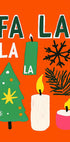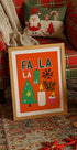 Festive Cheer Burst er en moderne, retro-inspireret juleplakat af Treechild: en farverig eksplosion af vinterglæde med grantræ, flimrende stearinlys og dansende snefnug. Legesyg typografi som 'Fa La La' spreder humor og varme, mens frostede nuancer af grøn og orange giver en hyggelig, grafisk julestemning.