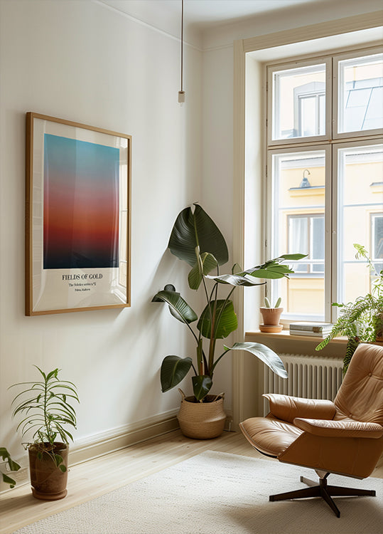 Fields of Gold – The Solstice Series Nr. 2 af Merel Takken skildrer bølgende, gyldne kornmarker under en blød, gradient himmel, hvor varme jordtoner møder skumringens sidste lys. Et minimalistisk, meditativt landskab med middelhavsstemning, der bringer ro, varme og sommerlængsel til rummet. En stille hyldest til lys, varme og tidløs ro.