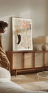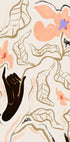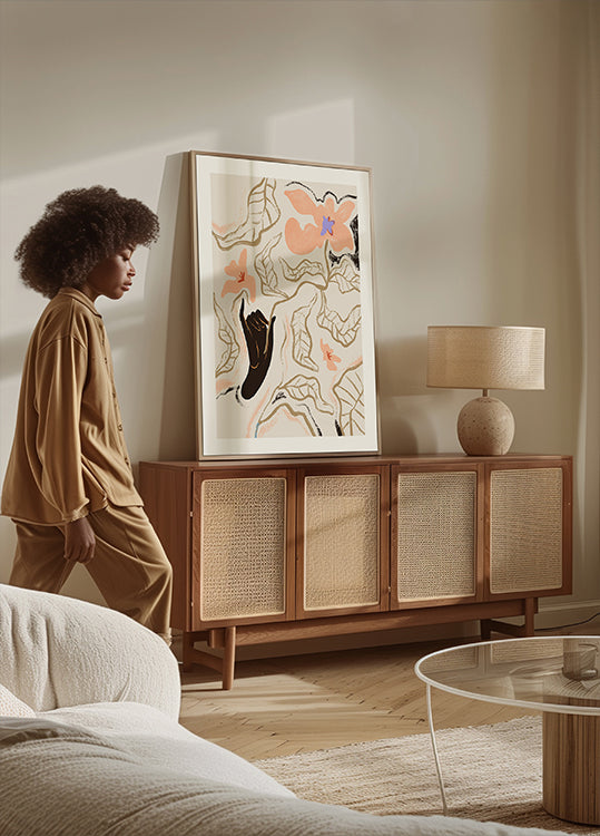 Et moderne abstrakt kunstværk med håndtegnede blomster i varme fersken- og abrikostoner. Den figurative sorte hånd skaber kontrast og dybde, og danner en poetisk forbindelse mellem menneske og natur. Dette udtryksfulde botaniske motiv kombinerer moderne landstil med kunstnerisk minimalisme, ideelt som vægkunst.