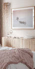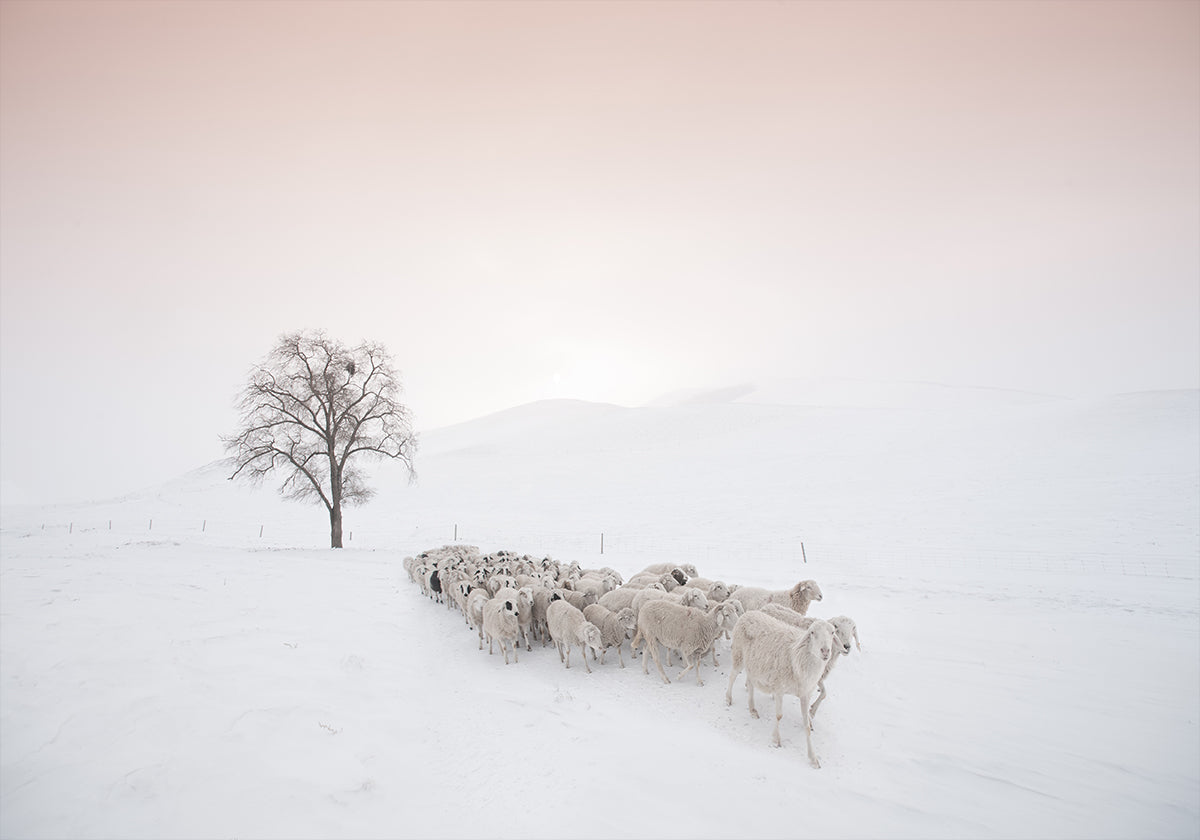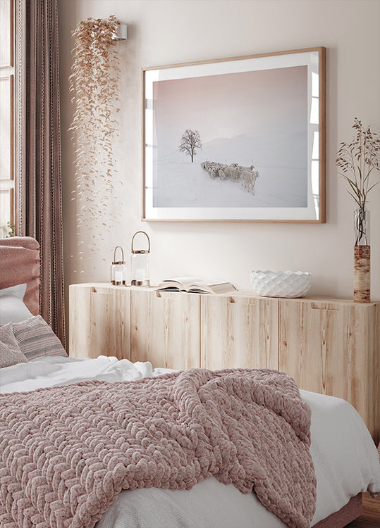 En rolig vintermorgen udfolder sig i blide pasteller: en flok får bevæger sig hen over det snedækkede landskab på jagt efter foder, mens en ensom træsilhuet står som stille pejlemærke i kulden. Den poetiske komposition fra Bingo Z indfanger landlig fred, frostklar luft og den sarte, lyserøde himmel.