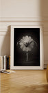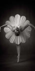 Et poetisk sort-hvidt fotografi af en ballerina, hvor tutuens form minder om en blomst. Fanget i en yndefuld positur på tåspidser, forener billedet elegance, balance og botanisk symbolik i en drømmende kombination af dans og natur.
