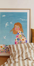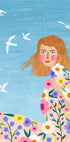 En finurlig og farverig illustration af en kvinde indhyllet i en blomsterkappe mod en klar blå himmel. Omgivet af flyvende fugle fremkalder værket frihed, glæde og forårets friske ånd. Legende, men også roligt, forener det natur og fantasi i en livlig moderne stil.