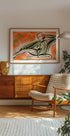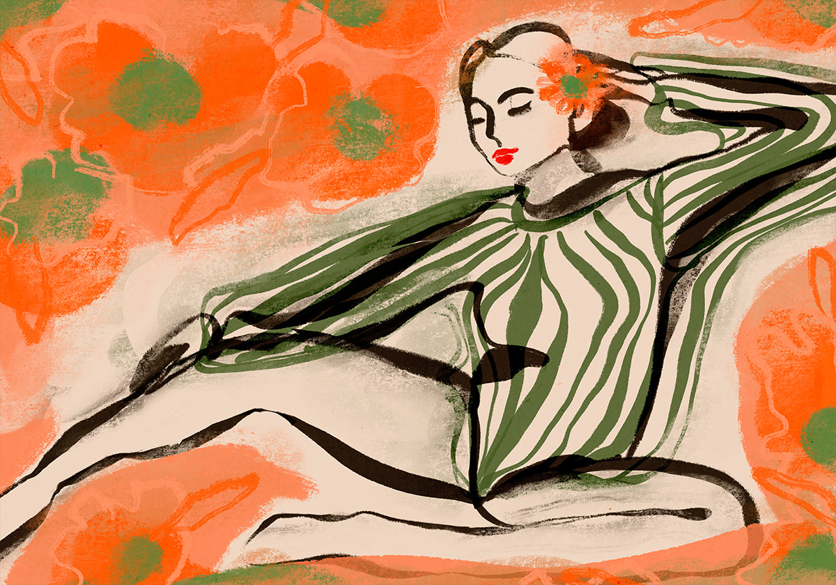 Floral Serenity af Treechild forener figurativ poesi og botanisk skønhed: en stiliseret kvindefigur i rolig positur omgivet af blomster og bløde blade. Grafiske linjer og en let malerisk tekstur mødes i en retro palet af grøn, orange og rød, der skaber harmonisk balance og tidløs elegance. Perfekt til nordisk indretning.