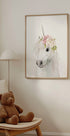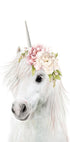 En drømmende og eventyrlig illustration af en enhjørning udsmykket med bløde pastelfarvede blomster. Den hvide baggrund fremhæver den magiske og blide stemning i dette fantasifulde kunstværk. Perfekt til børneværelser, institutioner eller til alle der elsker mytisk charme.