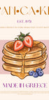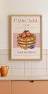 En charmerende plakat i vintage-stil med en stak luftige pandekager toppet med jordbær, blåbær og gylden sirup. Designet med retro typografi og pastelfarver, forener dette kunstværk madnostalgi med stilfuld dekoration, perfekt til køkkener, caféer eller morgenmadselskere.